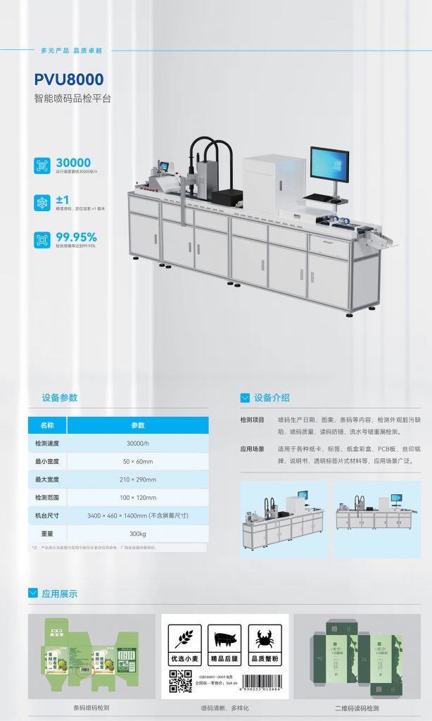 - 技術參數 PVU8000 智能噴碼品檢平臺技術文檔 ?一、核心參數 ?參數項??技術指標?檢測速度30,000張/小時最小檢測尺寸50×60mm最大檢……